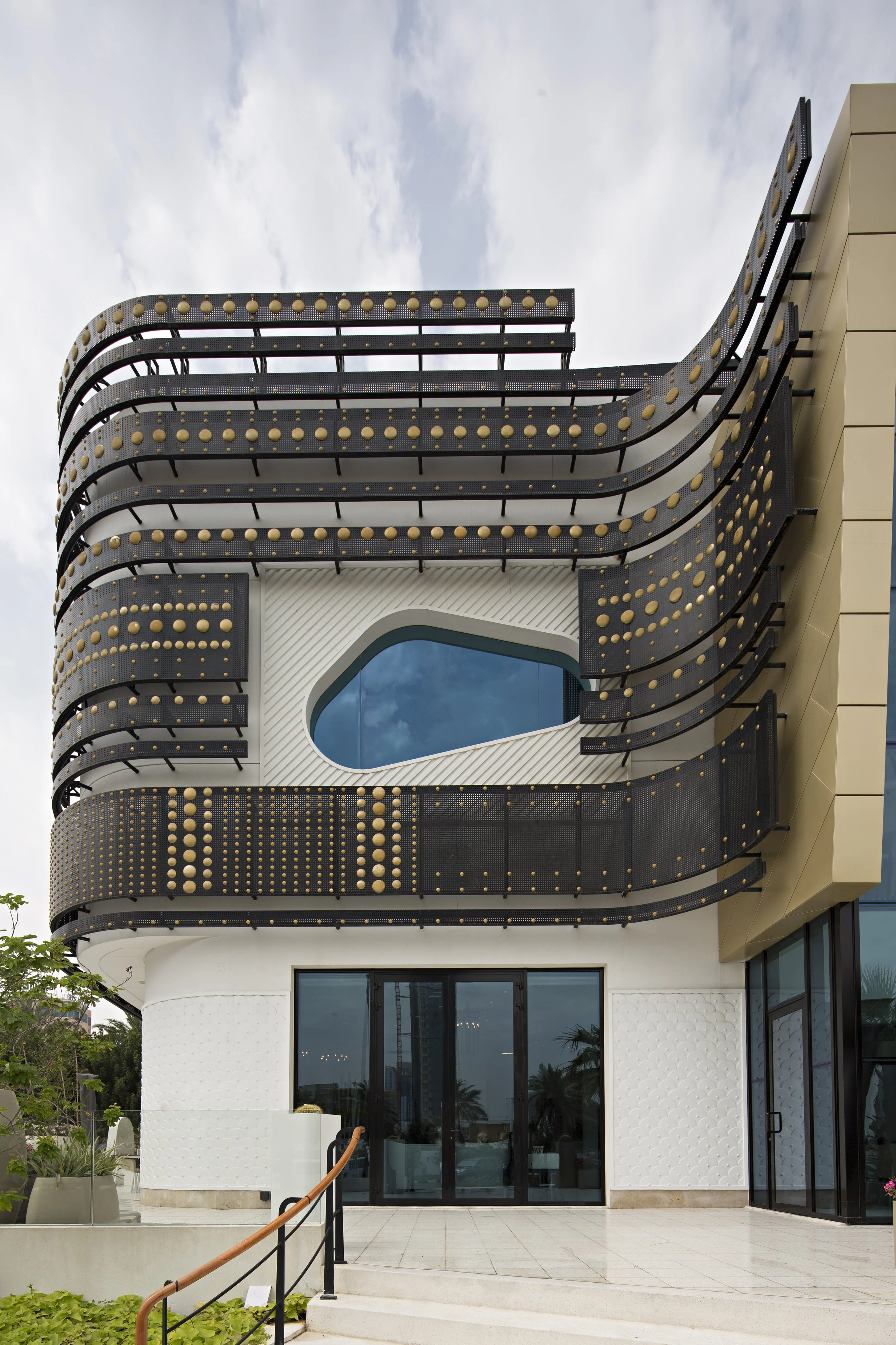 Dar Hamad Restaurant is designed to reintroduce Kuwaiti cuisine through a refined and nostalgic dining experience. The exterior concept draws inspiration from the sandoog mubayyat—a traditional wooden dowry box gifted to brides—and is expressed through an offset perforated metal ribbon that veils parts of the structure.