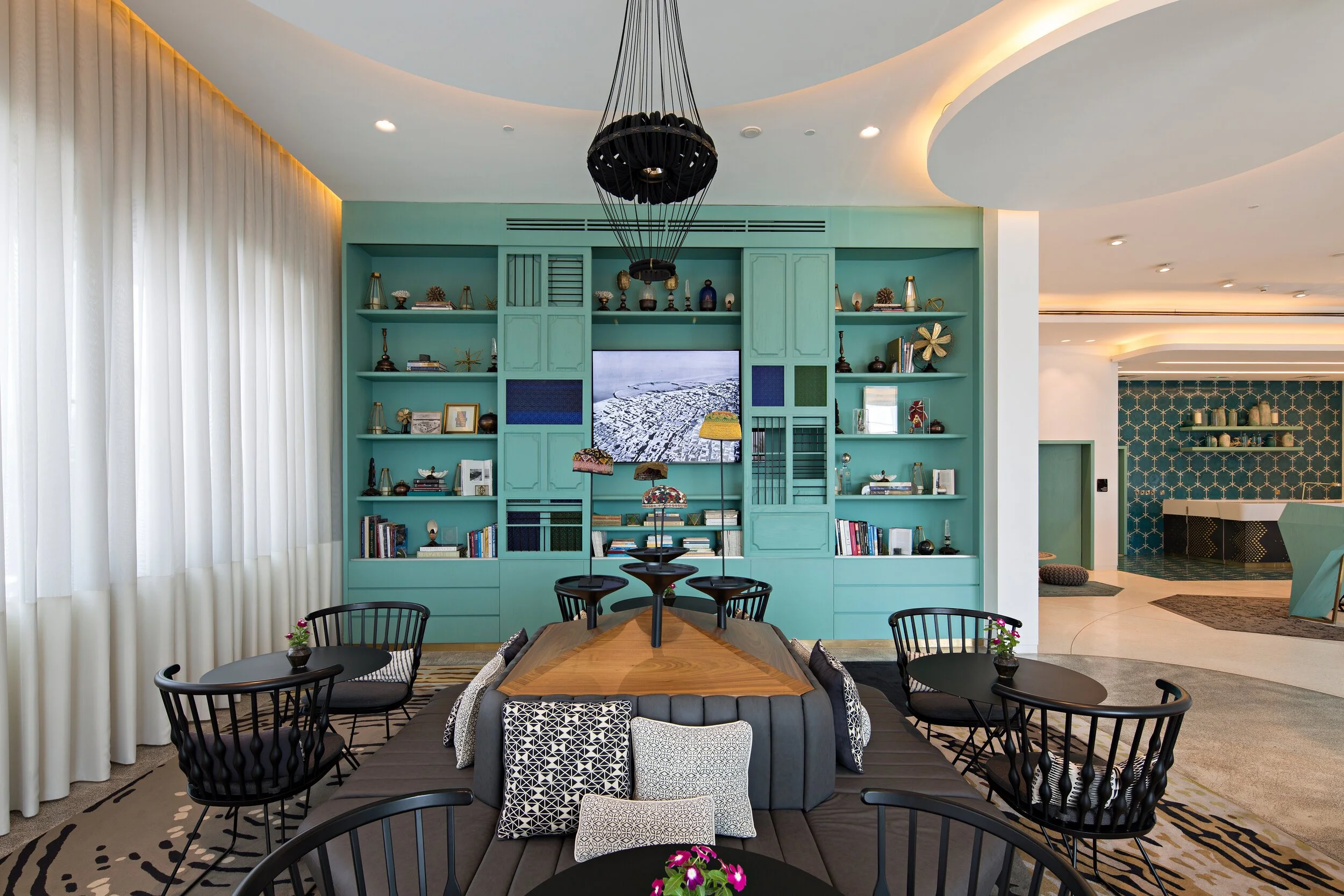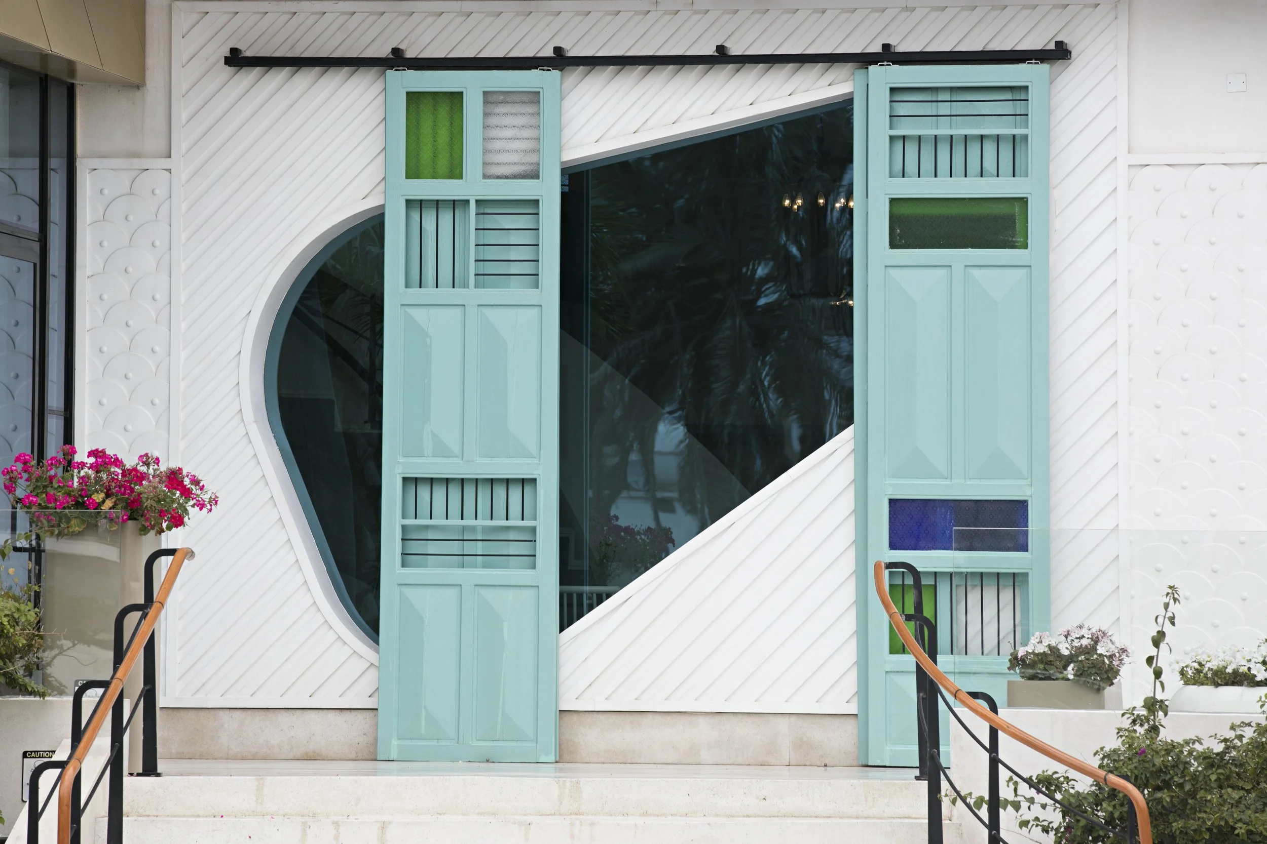 Traditional elements such as azure blue shutter windows and bab-bu-khokha wooden doors with metallic knockers add depth and authenticity to the space.